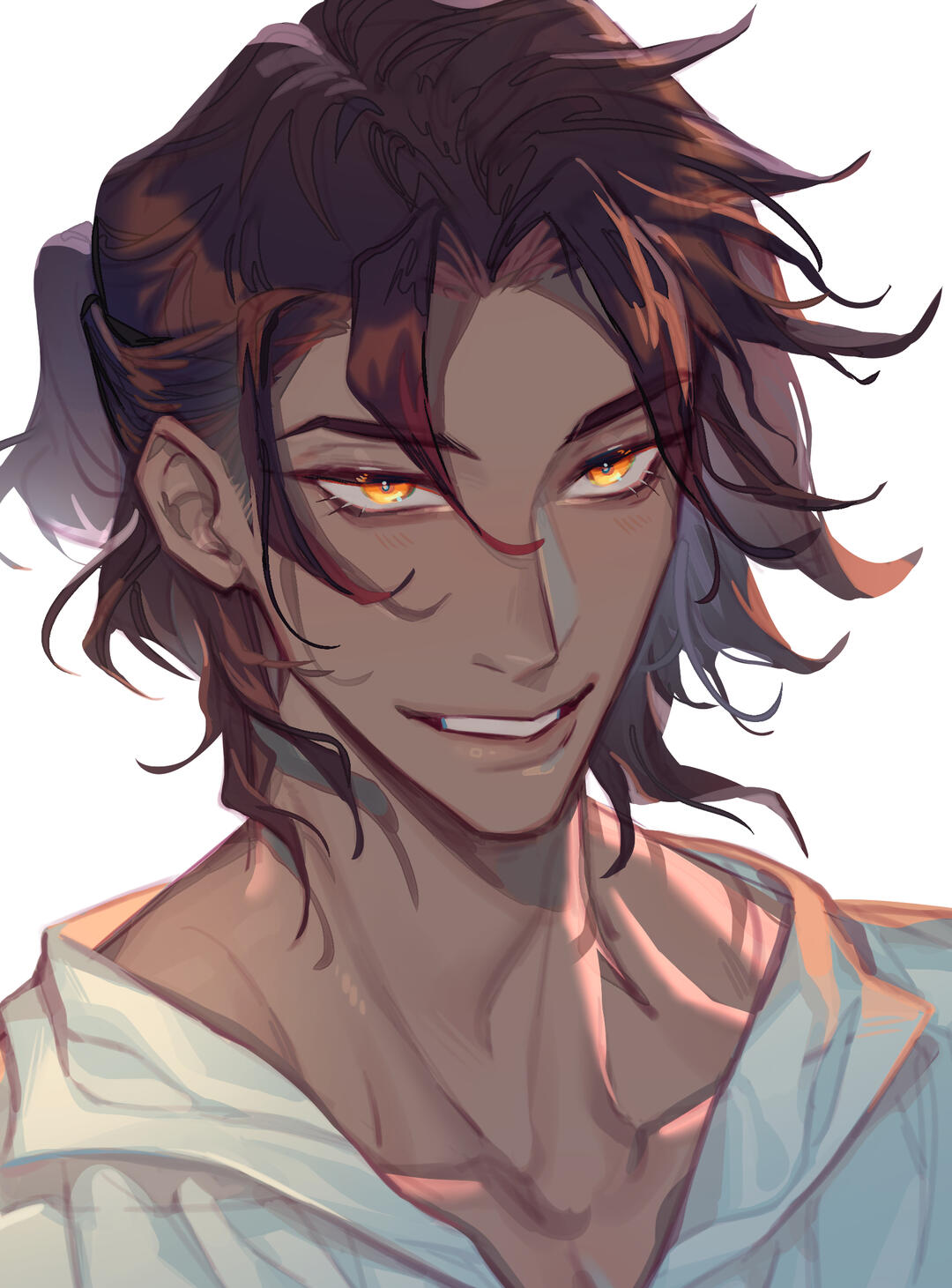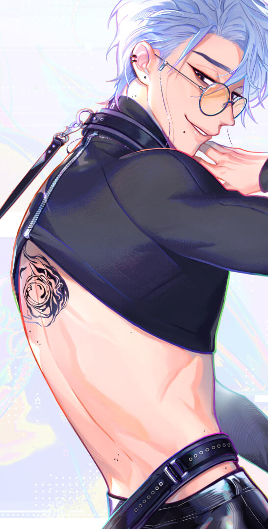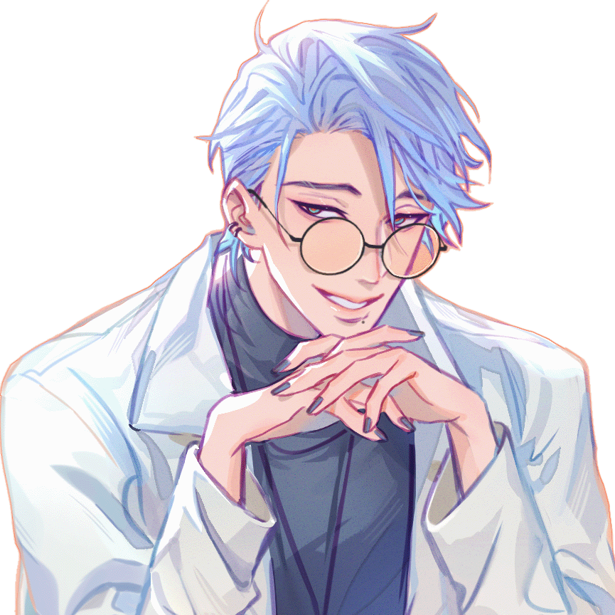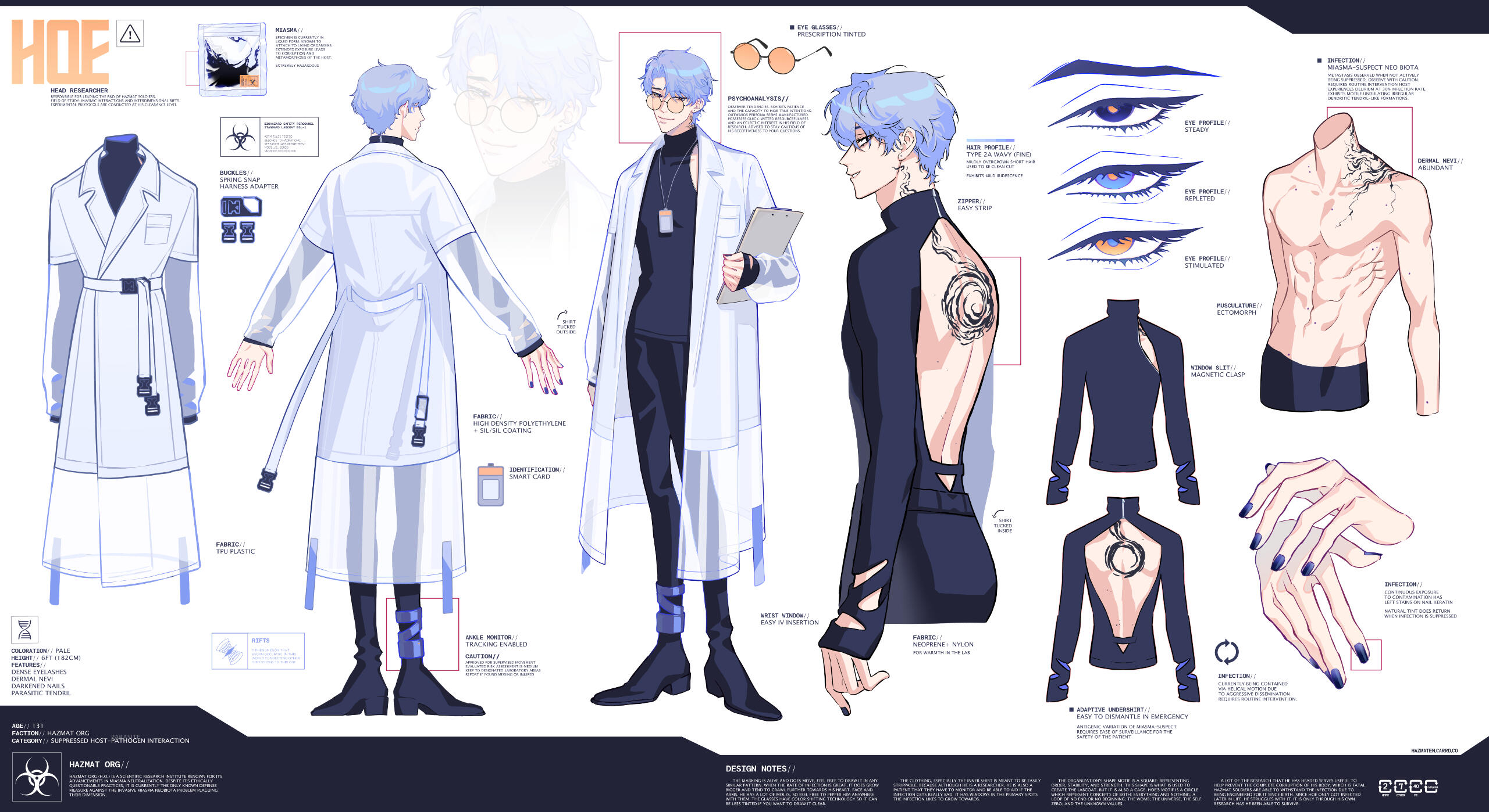 Miasma is the subject of Hoe's study, it consumes and corrupts living beings. They come in the form of many states, but it's most notable feature is the pitch blackness. It was originally from a world that had already ended and was leaked here through the rifts.Earth had become a mixing pot due to sporadic rifts from alternate dimensions. People, creatures, technology, and miscellaneous knick-knacks find their way dropped unto earth by these rifts. Sometimes these things advance the culture and technology, and sometimes they're detrimental.Hazmat org is at the forefront of miasma corrective efforts, creating biologically engineered soldiers called Hazmats in order to neutralize the miasma spread.The reason why there's the ominous sprawling dark marks that branches towards his neck is unknown, though miasma is the primary suspect. Although he isn't able to neutralize it completely, he was able to use his knowledge as well as the technology at his disposal to keep it in a stasis state. It's dubious whether his mind and body are unscathed from its influence.His role is actually portrayed as the villain in the story. It's hard to tell his intentions, and even harder to decipher his actions (because he's conniving and perceptive). I like to paint him in a mysterious light that keeps people guessing. He's calm, confident and self assured